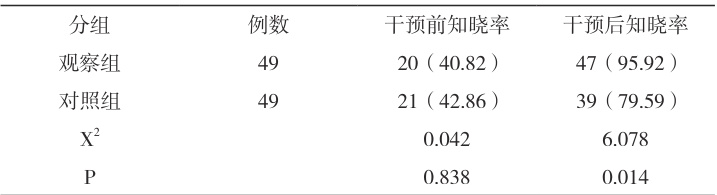 干预后观察组院感知识知晓率明显提升,且高于对照组, P<0.05 ,见表1 :表1 比较 [n(%)]