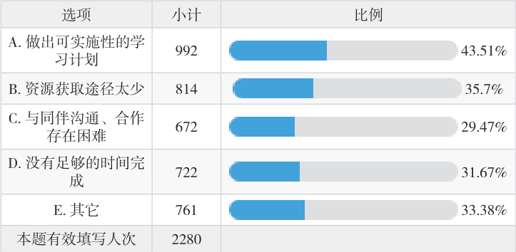 (图一)这表明,学生对合作学习和项目式学习形式接受度高。项目学习具有趣味性和实践性的特点,将为学生学习提供内在动力,进一步激发学生的学习兴趣,满足学生的好奇心和探索欲。2. 学生学习能力与基础分析。从调查问卷可见,学生在综合性学习活动中遇到的最大困难主要集中在以下几个方面:一是“做出可实施性的学习计划”(43.51%),二是“资源获取途径太少”(35.7%),三是“与同伴沟通、合作存在困难”(29.47%),四是“没有足够的时间完成”(31.67%),五是“其它”(33.38%)(见图二)。目前,你在综合性学习活动中遇到的最大困难是 [ 多选题]
