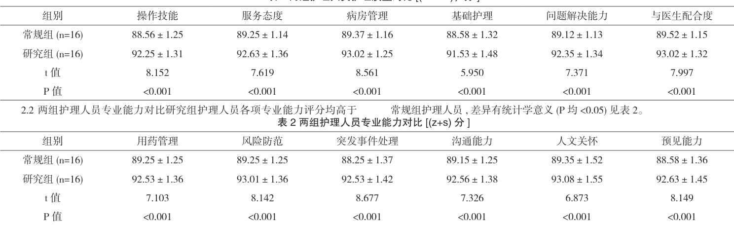2.1 两组护理人员护理质量对比研究组护理质量评分高于常规组 , 差异有统计学意义(P 均 <0.05 。见表 1。