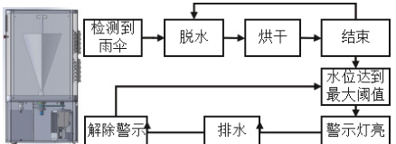 本文设计的雨伞干燥设备如图 1 所示,该设备长 700mm 、宽 600mm 、高1325mm。具体技术原理和干燥步骤如图 2 所示。当传感器检测到有雨伞时,PLC 先后控制脱水机构和干燥机构进行脱水、干燥;当液位传感器检测到集水装置水位达到阈值时,系统提示操作员排水。关键功能为:1)脱水:夹紧伞柄并进行旋转产生离心力,甩离伞面水珠。2)干燥:干燥模块包含加热器、风机和百叶窗等机构,风机将加热后的空气吹向伞面进行干燥。3)集水:集水装置收集废水,且当水位达到最大高度阈值时警示排水。4)检测:以多种传感器为检测元件,分别检测上盖启闭、雨伞到位及内部温度和湿度等信息。5)控制:以可编程控制器为主控系统,结合 HMI 输入和反馈,实现设备控制与干燥过程管理。