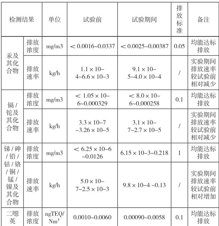 表1 :试验前后烟气中重金属及二噁英监测结果一览表