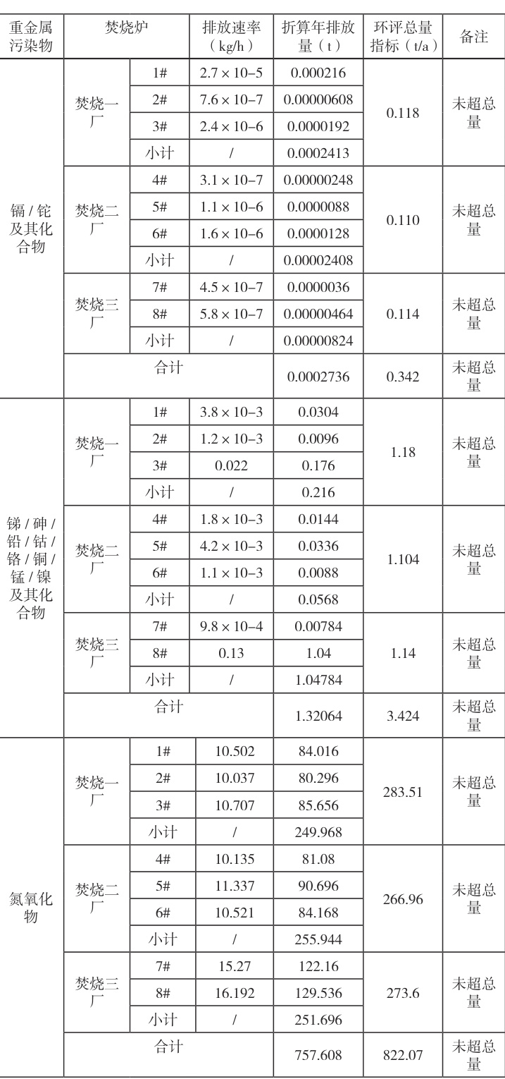 根据《南海生活垃圾焚烧发电厂提标扩能工程环境影响报告书》,焚烧一、二、三厂汞及其化合物、镉 /铊及其化合物、锑 / 砷 / 铅 / 钴 / 铬 / 铜 / 锰 / 镍及其化合物、氮氧化物总量控制指标分别为 0.342t/a、0.342t/a、3.424t/a、822.07t/a。次采用排放速率核算重金属排放量,焚烧炉年工作时间按年工作8000h 计算,重金属排放量如表2 所示:表2 :试验期间折算烟气中重金属及氮氧化物排放量