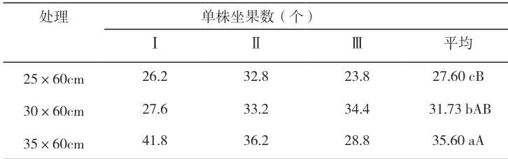 单株坐果数在 30×60cm 密度最高(31.73 个),三种密度间差异显著(P<0.05)
