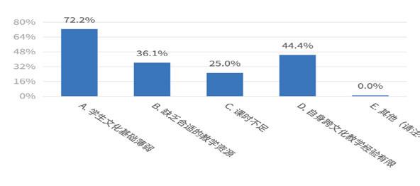 在国际理解教育内容教学中,教师遇到的最大困难是学生文化基础薄弱,占比 72.2%,其次是自身跨文化教学经验有限,占比 44.4%, 缺乏合适的教学资源和课时不足也是教师面临的困难,占比分别为 36.1% 和 25%。
