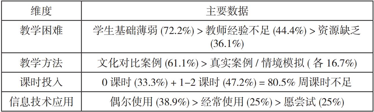 教学深度不足:80% 的教师用于国际理解教育的课时在 2 节及以下,难以系统、深入地开展教学活动,导致教学内容碎片化,学生难以形成完整的国际理解知识体系和能力素养。