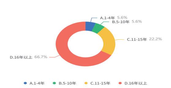 参与调查的教师中,教龄在 16 年以上的占比最高,达 66.7%,其次是 11-15 年教龄的教师,占比为 22.2%,1-4 年和 5-10 年教龄的教师占比较少,均为 5.6%。