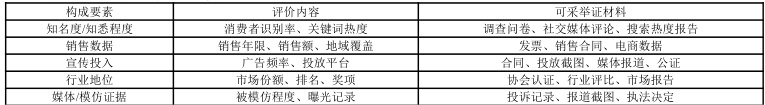 举证示例:行业协会排名、销售额占比、评选获奖资料。5. 被模仿或媒体引用情况(辅助要素)