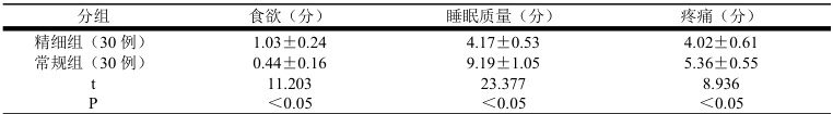 本次研究中,精细组在精细化护理下,饮食评分为( (1.03±0.24) )分、睡眠质量评分为( (4.17±0.53) )分、疼痛评分为( 4.02±0.61 )分,食欲,睡眠质量和疼痛改善情况明显优于常规组;精细组并发症发生率为 10% ,低于常规组的 36.67% ,P 均 <0.05 ,具统计学意义。