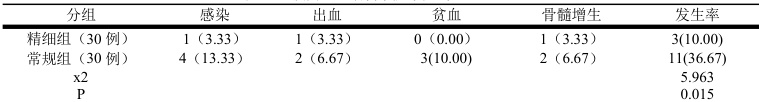 精细组在精细化护理下发生感染、出血、骨髓增生的患者均为 1 例,无患者发生贫血,并发症发生率为 10% ,低于常规组,P=0.015,详见表3.