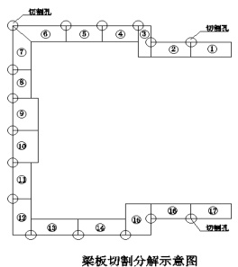首先将小里程端头井侧墙环梁进行拆除,利用打孔机在环梁底侧墙上打排孔,使侧墙与环梁分离。要切割拆除的混凝土结构梁板长度为 73.5m,预先对梁板弹墨线分块,提前开设切割孔,用水锯机沿着墨线进行分块切割,共分解成 17 块,每块混凝土板重约 8t,设吊装孔 2 个,利用吊车吊运至地面,再运出进行场外分解。梁板结构切割分解平面图如图4 所示。