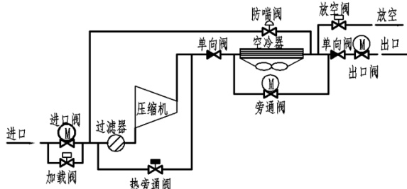 天然气管道离心压缩机组,其工艺管路在安装上差别不大。如图 1 所示为防止压缩机在生产运行中发生喘振,可在压缩机进、出口管线上,串联一个空气-天然气冷却器(空冷器)后、将防喘阀门与其并联安装,通过快速调节防喘阀开度,来调节通过压缩机的流量,防止压缩机组的喘振[1]。