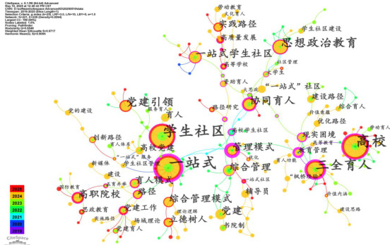 时区图展示了高校一站式学生社区研究在不同年份的发展情况。从图中可以看出,2019 至2020 年期间,研究主要集中在高校、教育管理、三全育人等基础概念上,这些概念构成了后续研究的基础。随着时间推进,2021至2022 年,一站式学生社区、高校党建、学生社区等关键词逐渐凸显,标志着研究开始聚焦于一站式学生社区的具体模式和党建引领作用。到了 2023 至 2025 年,国防教育、文化育人、高质量发展等新兴主题不断涌现,表明研究内容在不断拓展和深化,从基础模式探索向多元功能和高质量发展方向转变。