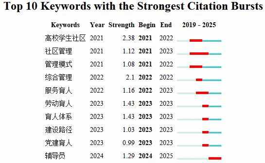 从图中可知,2021 年“高校学生社区”“社区管理”“管理模式”等关键词突现,表明这一年是相关研究开始集中关注具体实践模式的节点。2022 年“综合管理”“服务育人”等关键词突现,说明研究开始向管理与育人的综合层面拓展。2023 年“劳动育人”“育人体系”“建设路径”等关键词突现,反映出对育人体系和实践路径的研究热度上升。2024 至2025 年“辅导员”关键词突现,预示着辅导员在高校一站式学生社区中的角色和作用成为新的研究热点。