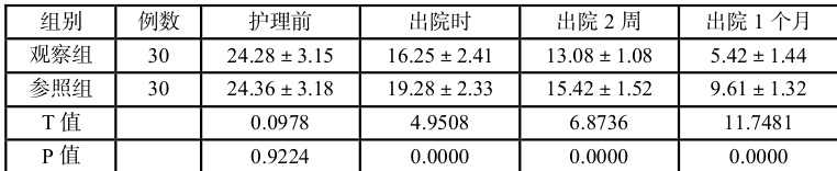 (1)心理压力对比:分别针对两组患者护理前、出院时、出院 2 周、出院 1 个月的心理压力指数进行分数的评估,若分值范围在 0~5 分代表患者的心理状态处于正常;若分值范围在 6~10 分代表患者的存在轻度的压力;若分值范围在 11~20 分代表患者存在中度的压力;若分值范围在 21~31 分代表患者存在重度压力。