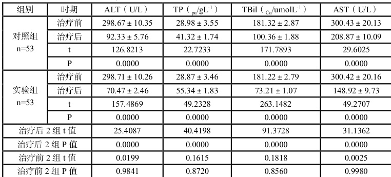 数据汇总见表 3,对照组、实验组治疗前肝功各项指标上对比无差异, ΔP>0.05 ;对照组肝功和治疗前、实验组肝功和治疗前,实验组、对照组治疗后 TP、AST、TBil、ALT 指标对比有统计学意义,P<0.05 。
