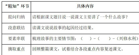 例如在教学四上第六单元的课文《西门豹治邺》一课时(如上表 2),笔者通过上述四个环节,从回顾四上第四单元“了解故事的起因、经过、结果,把握文章主内容”的方法,提供支架让学生讲清楚、讲通顺主要内容。再结合故事中的几个重要情节的深度剖析,引导学生了解更多说清故事的方法,进而达成本单元“复述课文”的学习要点,“精简凝练”以达“精知”。