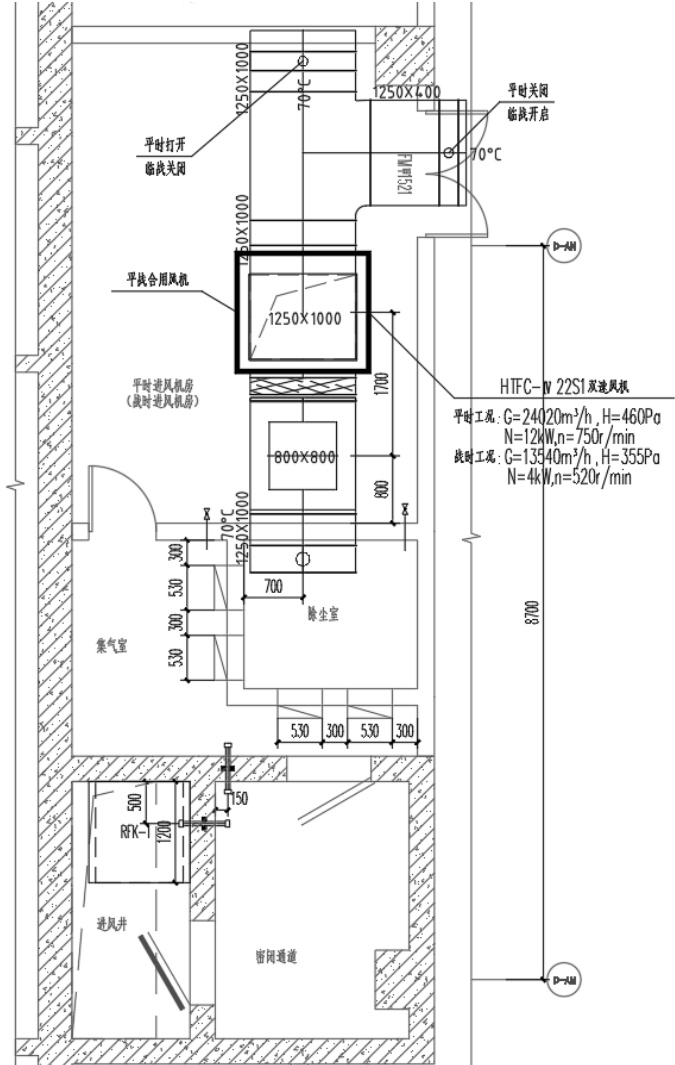 在设备选型方面,优先选用具有双速运行功能的通风设备。以人防二等人员掩蔽所为例,选用 HTFC-Ⅳ-18 型双速离心风机,其低速运行时风量 7050m3/h 、功率 2.8kW,可满足战时清洁通风需求;高速运行时风量可达 18000m3/h 、功率 8kW,符合平时消防补风要求。通过风机入口端设置智能阀门,可实现平战模式的快速切换。
