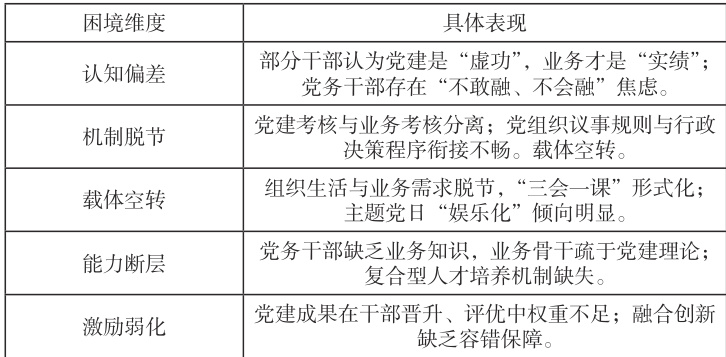 现实工作中,党建业务相融合的困境维度和具体表现体现在以下几个方面: