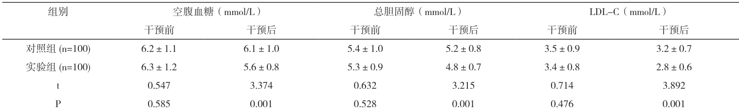 2.2 两组患者生化指标:干预 1 年后,实验组的空腹血糖、总胆固醇及 LDL-C 水平均低于对照组,差异有 统计学意义(P<0.05),具体数据详见表2。
