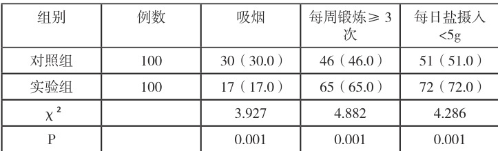 2.3两组生活方式改善情况比较:干预1 年后,实验组的吸烟率显著低于对照组,而每周锻炼 ⩾3 次的比例、每日盐摄入量控制在5g 以下的达标率均高于对照组,具体数据见表3。