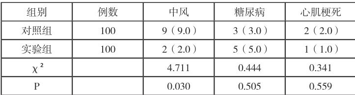 2.4两组不良事件发生情况比较 : 随访1 年期间,实验组新发中风2 例,显著少于对照组的9 例,差异有统计学意义(P<0.05);而两组在新发糖尿病、心肌梗死的发生率方面比较,差异无统计学意义(P>0.05),详见表4。