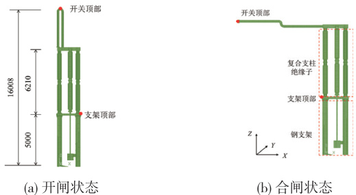 本文以某变电站 ZGW6 型隔离开关支架机构为分析对象,该机构采用机械手式单臂折叠设计,具有以下结构特征:采用双柱式单臂折叠插入架构,支柱绝缘子通过三角支撑结构实现稳固固定,分合闸操作通过折叠伸缩运动方式完成。根据相关设计资料,在 ANSYS 中分别建立了隔离开关支架机构的动侧结构在开闸状态和合闸状态的有限元模型,如图 1 所示。整体结构采用实体单元SOLID 95 建模,模型中省略了对结构动力特性影响较小的电气元件。图中,坐标轴 X 向为结构长度方向,坐标轴 Y 向为结构宽度方向。