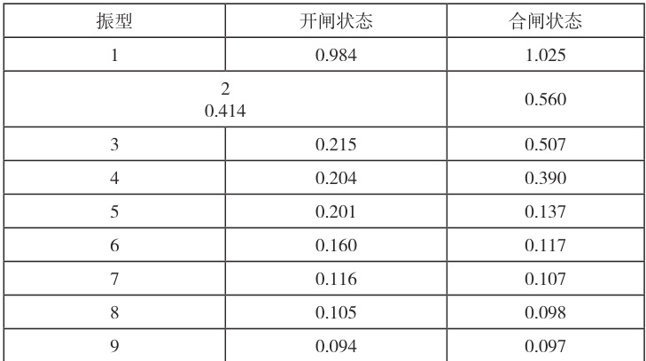 在进行合理的网格划分后,首先通过模态分析方法验证了隔离开关支架有限元模型的准确性。针对该机构的特殊结构特征,选用 Block Lanczos 法进行模态参数提取,该方法特别适用于处理具有对称质量和刚度矩阵的大型工程结构,收敛速度快。由于在结构的振动过程中较低阶的固有频率和对应的振型起主要作用,因此在模态分析时,选取隔离开关支架结构的前 10 阶模态进行分析,分别求解并提取其在开闸状态和合闸状态的自振周期,如表 1 所示。此外,通过观察各阶振型发现,在开闸状态下,隔离开关支架结构第 1、3、4、7、8 阶振型为平面外弯曲振动,第 2、5、6、9 阶振型为平面内振动,第 10 阶振型为扭转振动;在合闸状态下,隔离开关支架结构第 1、3、5、6、7阶振型为平面外弯曲振动,第 2、4、8、9 阶振型为平面内振动,第10 阶振型为扭转振动。