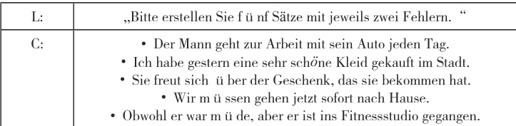 在日常教学特别是德语专四备考中,改错题是常见题型,尤其适于提高学生的语言敏感性。通常每句含两处错误,涵盖动词变位、语序、介词搭配等典型语法点。与 ChatGPT 互动发现,该模型在生成符合要求的改错题时存在明显局限:
