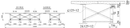 某三孔一联 3×40m 钢 - 混组合梁桥,结构形式为先简支后桥面连续。桥面分幅,单幅宽 16.8m 、由 6 片梁组成。单个组合梁高2.08m、梁间距2.8m,宽跨比为0.42,截面如图1.1 所示。组合梁榀内5m 布置一道横梁,榀间10m 布置一道横梁。