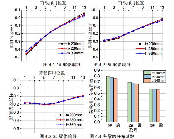 (1)桥面板厚度增加,1#~3# 梁的荷载横向分布影响线逐渐平缓,影响线竖标的最大值有所下降,说明主梁的横向刚度与整体受力性能得到一定的增强;