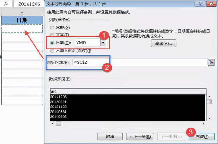 1.修正数据格式:若已制作好挂接目录且存在成文时间格式错误问题,先新建一个 EXCEL 表,把文件级目录里的成文时间这一列全选粘贴到新建的表里,选中数据区域,单击【数据】选项卡,点击【分列】→【下一步】→【下一步】,勾选【日期】YMD,把目标区域框里的定位数值删除,选择 C2 单元格(若不选择,会覆盖原数据),点击【完成】。