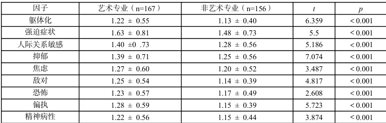 2.3.艺术专业与非艺术专业大学生SCL-90 测试结果的比较