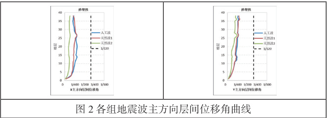 (4)从层间位移角曲线看,各条波作用下的曲线趋势基本一致。其中人工波作用下楼层位移角略大。
