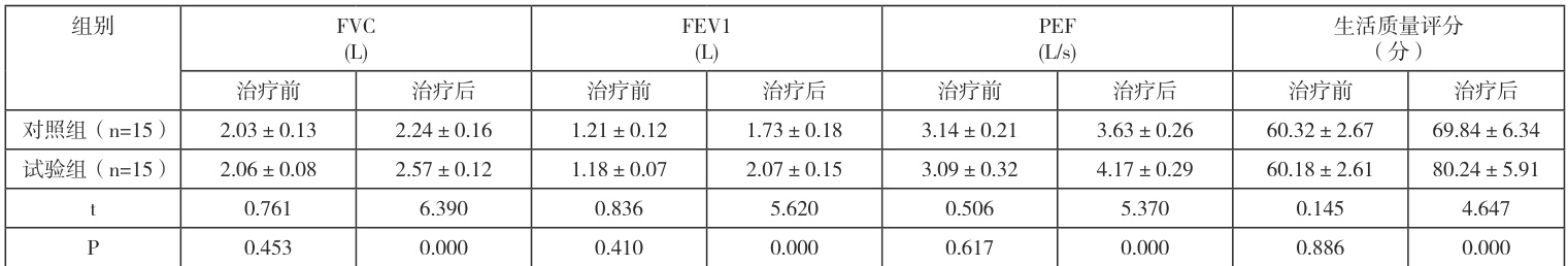 表 1 治疗前后的肺功能指标水平与生活质量评分的变化比较