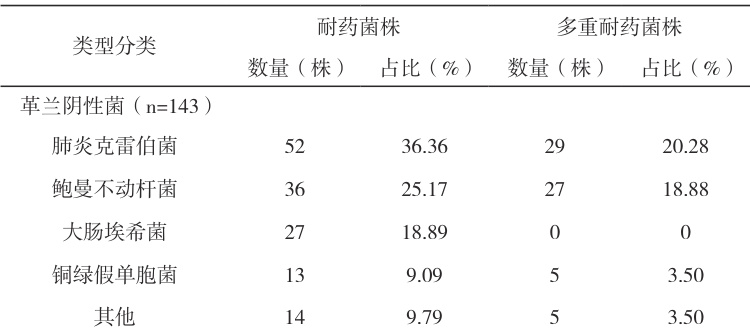 120 份标本中,共检出143 株革兰阴性菌,其中肺炎克雷伯菌和鲍曼不动杆菌是革兰阴性菌的主要来源。
