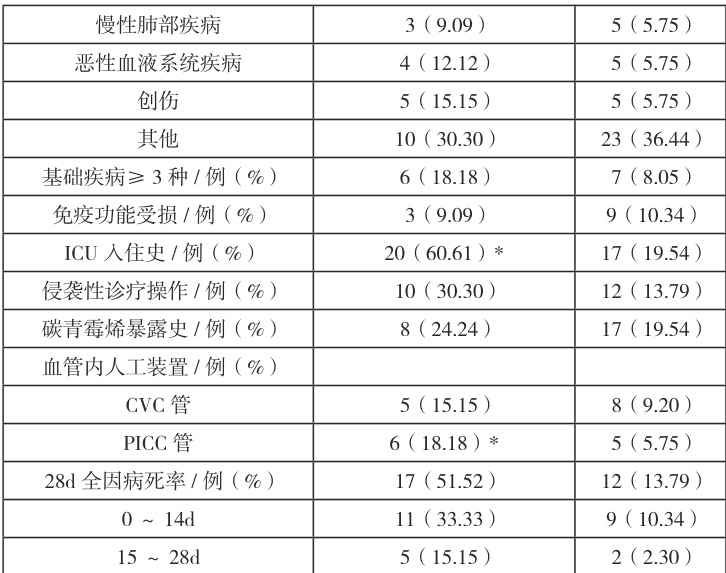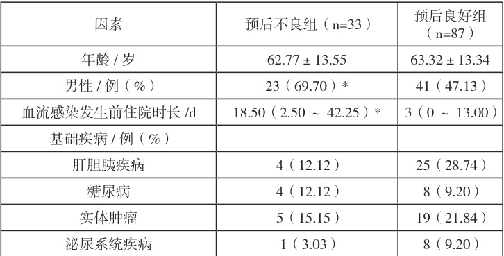 2.2 两组病人的单因子分析比较从表 2,可以看出,在男性、有 ICU 入住史、留置中心静脉导管以及血液感染的病人中,预后不良组与预后良好组比较,有显著性差异(P<0.05)。两组患者年龄、基础疾病(肝胆胰疾病,糖尿病,实体肿瘤,泌尿系统疾病,慢性肺部疾病,恶性血液系统疾病,基础疾病3 种以上,免疫功能低下,侵袭性诊疗操作,碳青霉烯暴露史,CVC 置管,P 均>0.05)。见表2。