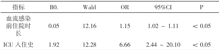 从表3 可以看出,有无ICU 入住史和入院时间是CR-GNB 血流感染的独立危险因子(P<0.05)。
