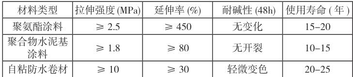 加强材料质量监管,必须从源头抓起。采购阶段建筑企业应选择经过权威认证的防水主流材料(见表 1),防水涂料的延展率应不低于 300% ,抗老化性能达到 20 年以上的标准。所有材料进场后,需进行抽样检测,使其物理性能符合设计要求,防水卷材厚度必须达到 3 毫米以上,保证铺设时与基面完全贴合。施工过程中,施工人员应对密封胶条的耐候性进行严格检查,要求其抗紫外线、耐温差变化能力达到 50 年设计寿命。在搅拌砂浆时,精确控制水灰比,避免因比例失控导致砂浆强度下降,影响防水效果。储存材料的仓库应保持干燥通风,防止材料因受潮、霉变等因素导致性能下降,影响使用寿命。施工后期,所有外墙材料需定期检查,针对可能出现的老化开裂现象,及时采取补救措施,使用高分子聚合物修复材料,对出现裂缝的区域进行修复,保证防水层的持续稳定性能。