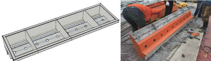加工成型模板最大宽度 569mm ,最大高度 216mm ,为方便人工操作进行安装调整,单块预制模板设计长度为 1.99m ,单块重量为 42kg ,安装时,模板之间采用螺栓连接,塑料泡沫板填缝。