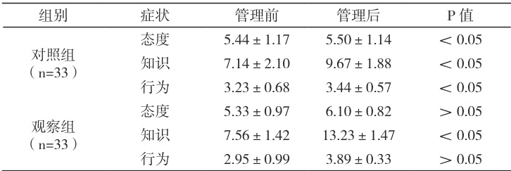 观察组患者中医慢病管理后 COPD 态度、知识、行为评分数据明显高于管理前 P<0.05 ;而对照组管理后只有 COPD 知识评分优于管理前 P<0.05 ,COPD 态度、行为评分结果显示 P>0.05 。详情见下表 1 :
