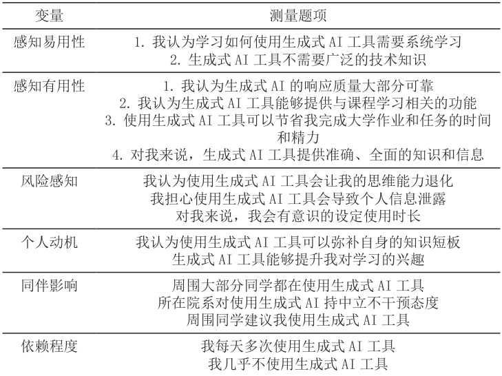 随着 GAI 技术的快速发展,学术界的目光主要聚焦在 GAI 在特定领域的应用现状和发展情况。国外的现有研究如 Jovanouic 等[2] 讨论了 GAI 的发展趋势并做出预测;P O’Donovan等[3] 人研究了人工智能在简化文献审查过程中的用途。国内的研究中,学者王伟正等 [4] 人探究了科研人员对GAI 的使用意愿受社会影响、享乐动机等因素的影响;刘键等[5] 人就生成式AI 的技术优势,讨论对文化创意产业经济的影响及齐志远[6] 认为生成式人工智能会给人类带来智能依赖、劳动误导等劳动强化风险。综上,已有的国内外文献对大学生个人使用GAI 工具的研究相对较少,且缺乏对其依赖的影响因素的实证分析。基于此,本文旨在研究大学生依赖GAI 工具的影响因素,为大学生正确合理使用GAI 工具提供参考意见。