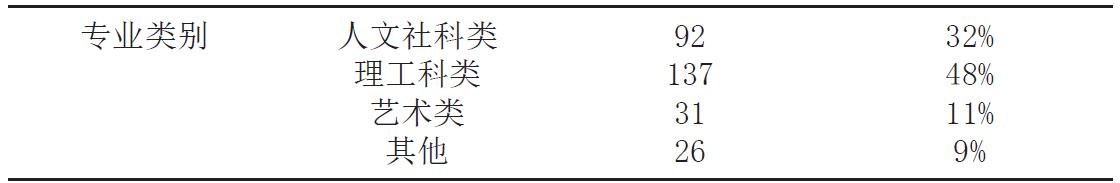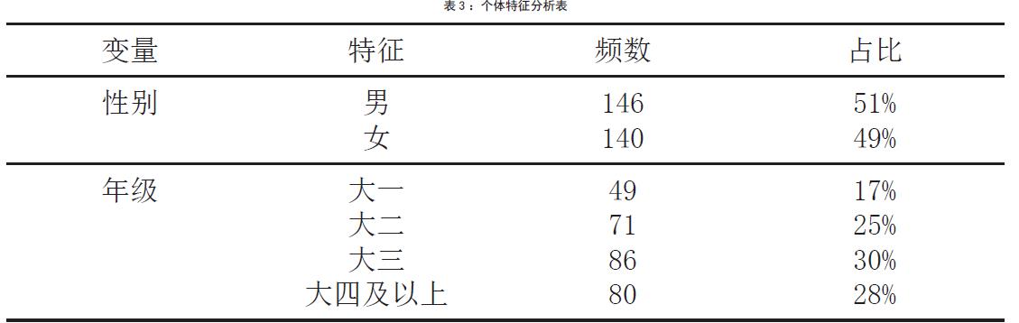 在调查对象中,个体特征中每个变量的有效填写人次均为286 次,其中,各变量的频数和占比如表3 所示,分析结果如下:调查对象中,女性占比49%,男性占比51%,性别分布相对均衡;年级分布上,大三学生最多,占比30%,大一学生最少,占比17%,可以看出,年级分布相对均匀;被调查者中以专业类别为理工科类学生为主,占比48%。