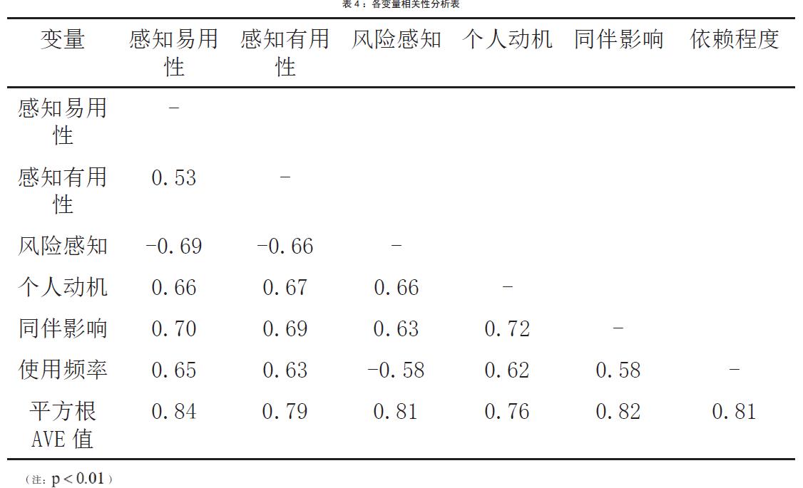 经相关性分析发现,各自变量与因变量使用频率之间呈现显著的相关关系,且各变量平方根AVE 值均大于相关性系数的绝对值,因此,区分效度理想。