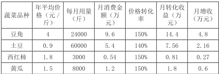 分析:根据表一,蔬菜转化收益很高,转化率达到140— 150% 。例如豆角,经过实体经济运作,月增收4.8 万元。
