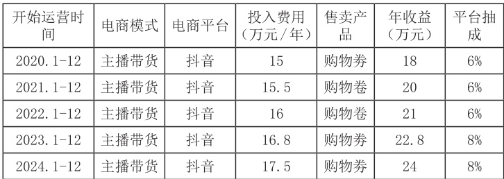 分析:根据表二,该电商模式稳定运营,投入出入不大,平台抽成在6%-8% ,其余投入(年投入)最大与最小之间差为 3 万,平均每年递增6000 元,成本控制稳定。收益也呈现逐年上升的趋势。收入最少和最多年份的差为 6 万元,平均每年增长 1.2 万元。形成稳定的增长模式。售卖产品为虚拟产品。