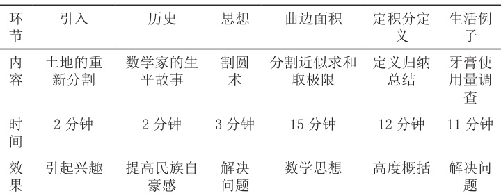 定积分定义内容需要一个课时45 分钟的时间展开教学,本节课的课程思政设计如表1 所示。