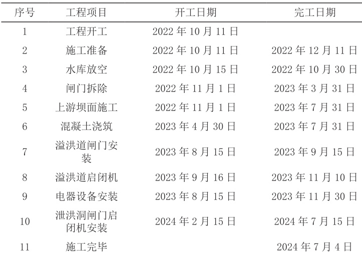 水利水电工程是一项复杂的系统性工程,在施工管理过程中涉及多方面的管理,包括质量控制、资源调配、施工计划、安全管理等。并且由于水利水电工程施工周期较长,所以需要在施工前夕制定完善的施工管理计划,在充分了解工程性质、目标和要求的基础上,明确施工过程中可能遇到的不确定因素,并预留一定的缓冲时间,以保证工程的顺利实施。同时,在水利水电工程施工中,也需要根据工程方案开展现场监督工作,在发现问题后及时解决。在本工程中一共包含 4 项重点工程内容,并涵盖了 25个分部工程,由于本工程施工工序较多,所以本文选择其中几道重点工序进行施工计划工期展示,具体如表1 所示。