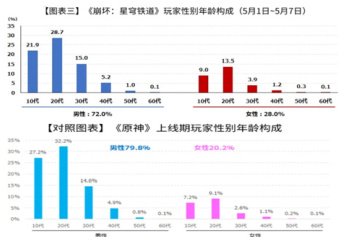 《崩坏·星穹铁道》的用户中,男性占 72.0% ,女性占 28.0% ,超过 70% 的用户是男性。在年龄分布上,主要集中在 10 至 30 岁的男性用户,这两个年龄段的男性用户占据了超过 50% 的比例。在年龄上来说年轻一代(30 岁以下)站绝对主流,而在男女比例来看,对比上线时期的男女比例,可以看出女玩家比例在逐渐增多,