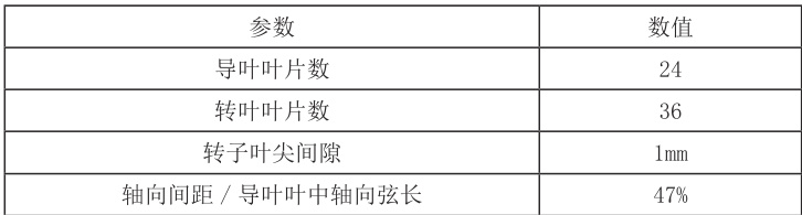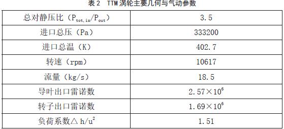 本文以 TTM 超 / 跨音涡轮作为研究对象,静叶叶片数是 24,动叶叶片数是 36。其中涡轮级出口的时均周向速度作为特征速度,涡轮级平均半径处的轴向弦长作为特征长度。该涡轮级的基本几何参数表1 所示。