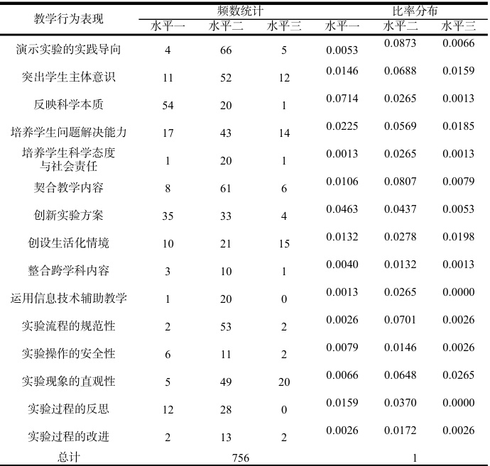 课堂录像中的演示实验教学行为与课标的重点分布有所异同。相同之处在于,教师演示实验教学行为与课程标准都在突出学生主体意识的水平二上为重点分布中心,且所占比率均达到了0.0600 以上。而不同之处在于,教师教学行为的重点分布包含了演示实验的实践导向的水平二、反映科学本质的水平一、契合教学内容的水平二、实验流程的规范性的水平二以及实验现象的直观性的水平二,而课程标准更关注反映科学本质的水平二、培养学生问题解决能力的水平二、培养学生科学态度与社会责任的水平二以及创设生活化情景的水平二。